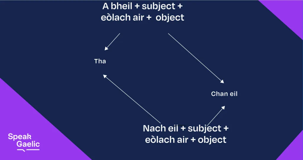 Eòlach means knowledgeable on or acquainted withand is always used with the air preposition.