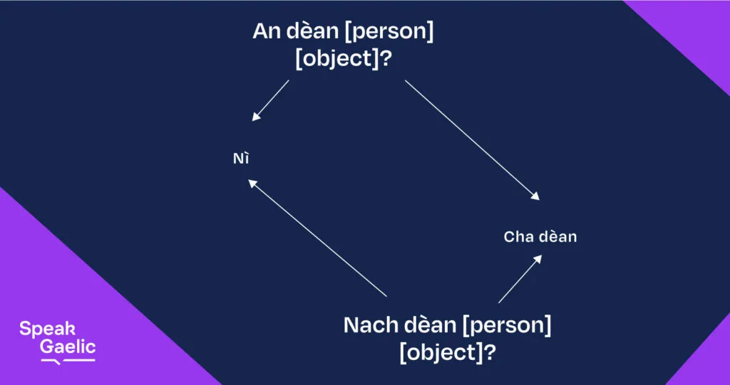 | dèan | Do / make | rinn | Made / did | Nì | Will do / make |