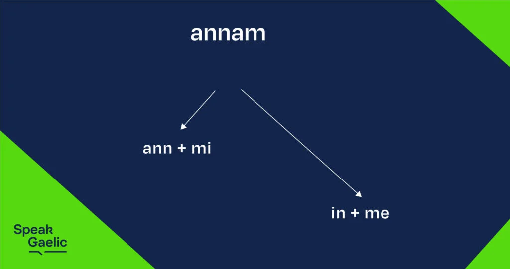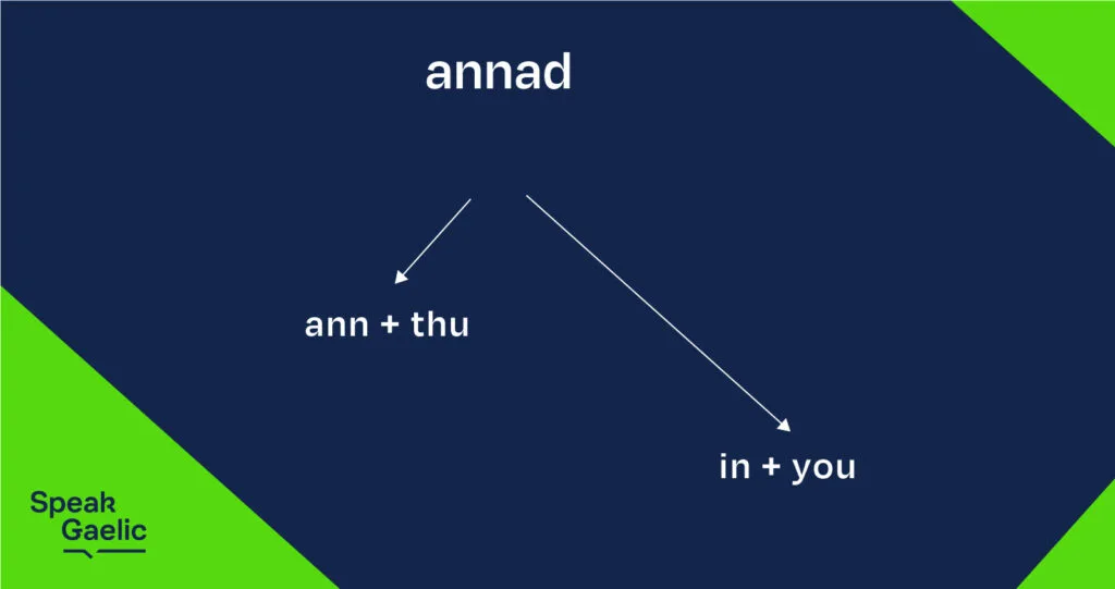 What happens if you want to say what another person’s nationality is, or your own? We need to learn the correct prepositional pronouns to give us these new sentences. We often use the preposition ann an (in) with a pronoun (e.g. I, you, it), to give us phrases such as “in + me” and “in + you”.