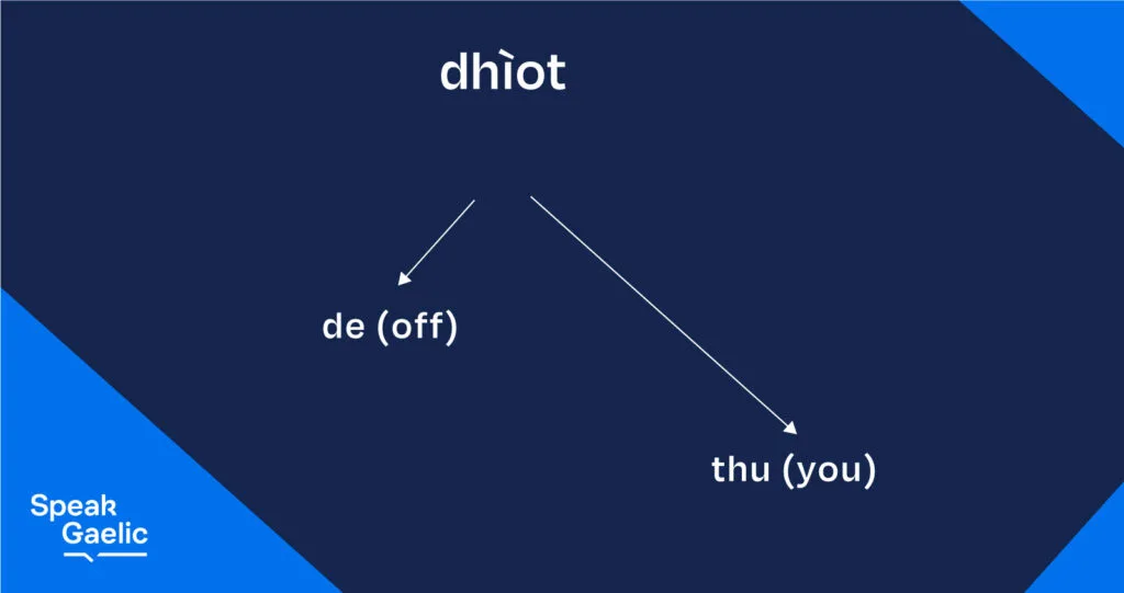 When telling someone to put something on or to take something off, we use cuir . This is the imperative or verbal root. Basically, it’s the form you use to issue instructions to people. To put something on we use air or a prepositional pronoun formed of air, and to take something off, use cuir with the preposition de or a prepositional pronoun formed of de (off). We will use dhìot (off you) in this topic, but we will go over the full range later in SpeakGaelic.