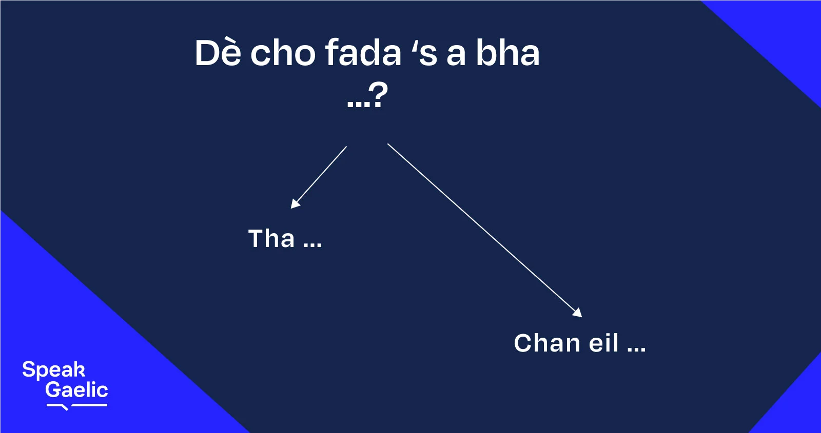 You already know the structures. We know from previous lessons how to structure our questions and answers. Only one word has changed - tha to bha . Tha is the present tense of ‘to be’ and bha is used here in the past tense . Although this is used in the dependent form here, it is also used in the independent form at the start of sentences.