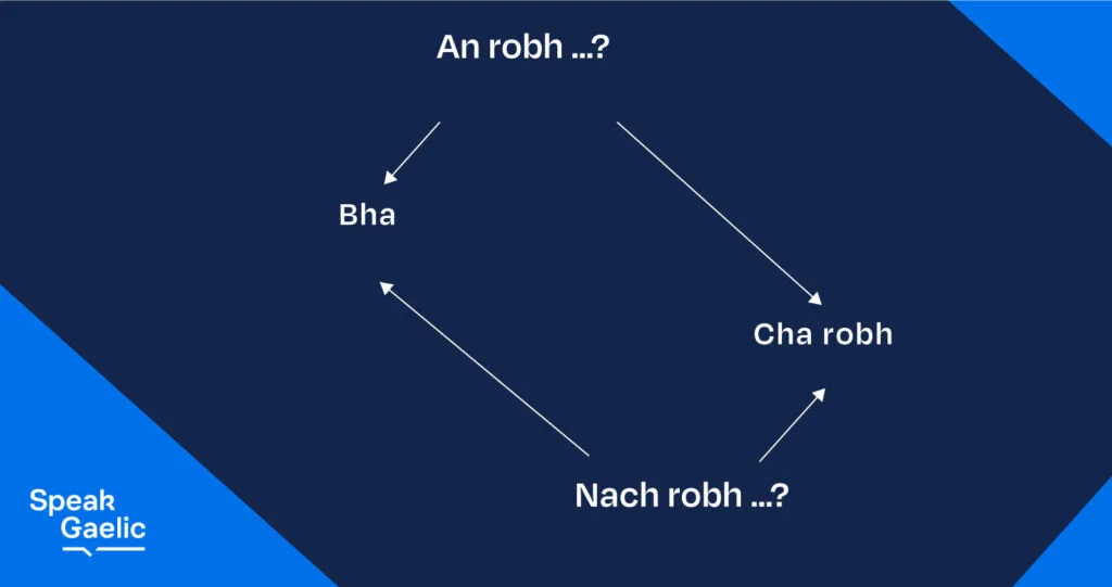 To ask a Yes/No question in the present tense we used A bheil…? In the past tense, we ask An robh…? The answer Yes is Bha and the answer No is Cha robh .